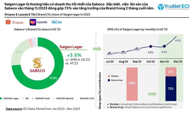 Sabeco mở gian hàng chính hãng từ tháng 11/2023. Trước đó, toàn bộ doanh thu của Saigon Lager trên Shopee đều đến từ các online sellers, nhưng tỷ trọng đóng góp này giờ đây chỉ còn 27%. 73% doanh thu của nhãn đến từ kênh Shopee chính thức.