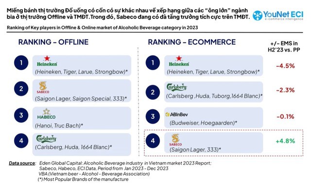 Thị phần ngành bia có sự khác nhau giữa kênh offline và online. Heineken, Carlsberg và Sabeco là ba cái tên xuất hiện trong top 4 thị phần của cả hai kênh bán, nhưng thứ tự khác nhau. Trong đó, Sabeco đang có đà tăng trưởng tích cực trên các sàn TMĐT.