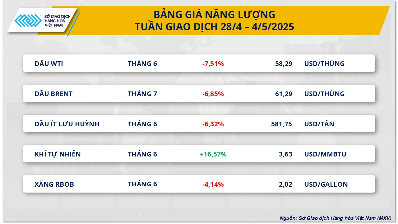 Đóng cửa tuần, giá dầu Brent dừng ở mức 61,29 USD/thùng, đánh mất 6,85%. Dầu WTI cũng ghi nhận mức lao dốc tới 7,51%, rơi khỏi ngưỡng 60 USD/thùng và chốt tại mức 58,29 USD/thùng.