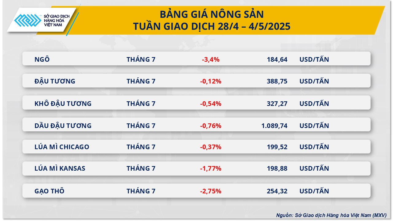 Riêng giá ngô ghi nhận tuần giảm thứ ba liên tiếp khi đánh mất khoảng 3,4% về mức 184 USD/tấn, trong khi lúa mì giảm nhẹ 0,37% về mức 199 USD/tấn nhờ lực hồi phục mạnh ở các phiên cuối tuần.