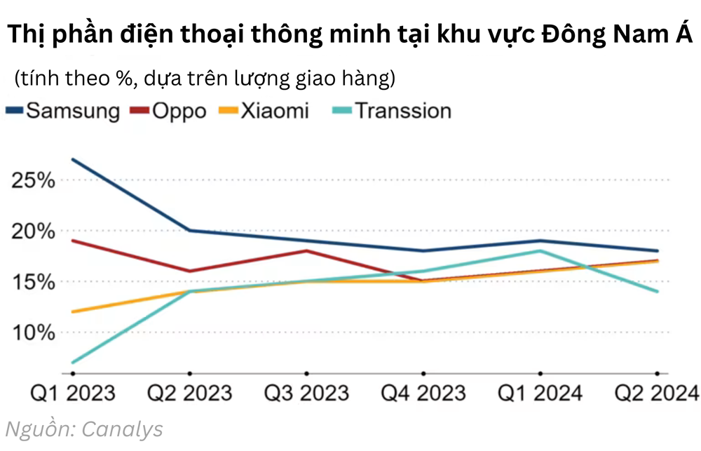 Trong khu vực Đông Nam Á nói chung, Transsion đứng thứ 5 với 14%. Công ty đã nhanh chóng mở rộng thị phần kể từ năm 2023, vươn lên từ vị trí gần như vô danh chỉ vài năm trước đó.