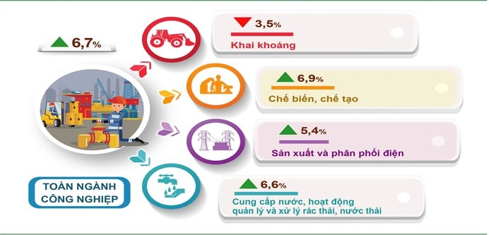 Một số ngành chế biến, chế tạo có chỉ số IIP tăng so với cùng kỳ năm trước như: Sản xuất xe có động cơ tăng 18,3%; sản xuất da và các sản phẩm làm từ da tăng 12,4%; sản xuất sản phẩm từ khoáng phi kim loại tăng 11%; sản xuất trang phục tăng 9,8%; sản xuất kim loại tăng 9,3%; sản xuất đồ uống 9,1%; sản xuất sản phẩm điện tử, máy vi tính tăng 8,9%; sản xuất hóa chất, các sản phẩm hóa chất tăng 8,8%; sản xuất sản phẩm dệt tăng 8,5%...