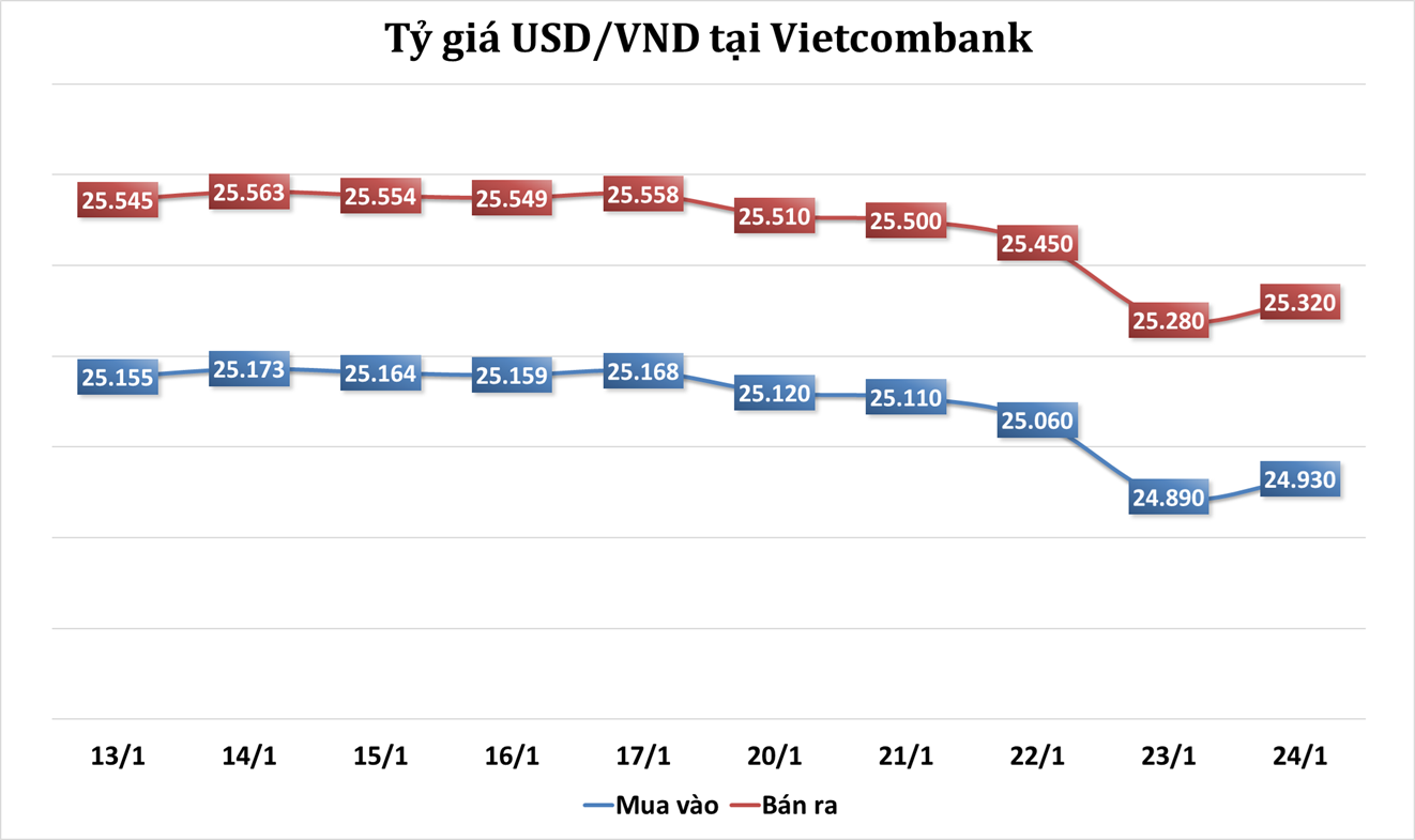 Theo khảo sát của thoibaonganhang.vn, tính đến 9h sáng nay (24/1), tỷ giá trung tâm giảm 3 đồng. Giá mua - bán tại tất cả các ngân hàng thương mại được điều chỉnh tăng với biên độ phổ biến từ 40-130 đồng so với phiên trước.