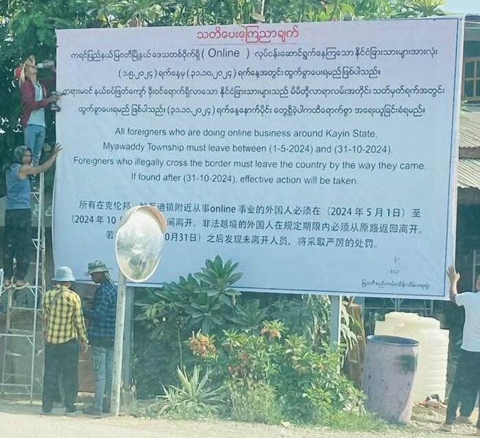 Một biển báo yêu cầu người nước ngoài tham gia kinh doanh trực tuyến rời khỏi Myawaddy trước ngày 30/10/2024. Ảnh: The Irrawaddy