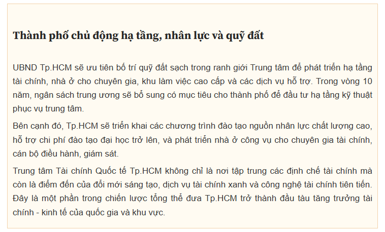 Theo đó, Trung tâm Tài chính Quốc tế tại Tp.HCM sẽ là khu vực có ranh giới địa lý rõ ràng, tích hợp hệ sinh thái đầy đủ gồm ngân hàng, chứng khoán, bảo hiểm, FinTech, tài sản số và các dịch vụ hỗ trợ.