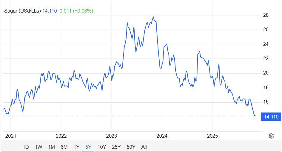 Giá đường xuống thấp nhất gần 5 năm (Nguồn: Trading Economics)
