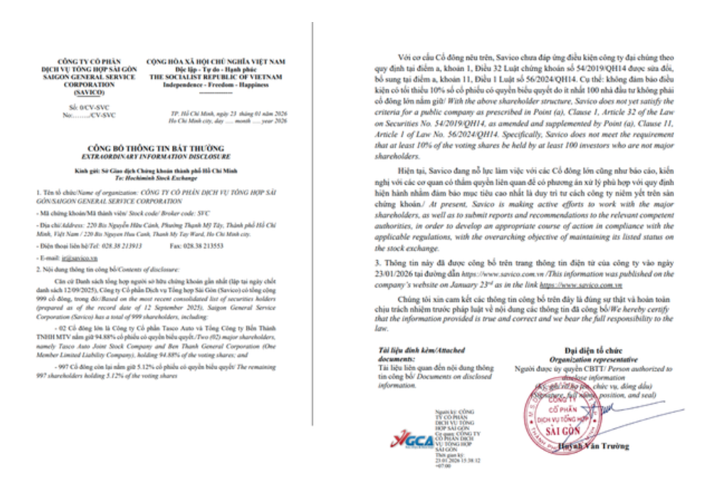 Công ty Cổ phần Dịch vụ Tổng hợp Sài Gòn (Savico) vừa công bố thông tin bất thường với nội dung Công ty chưa đáp ứng điều kiện công ty đại chúng.