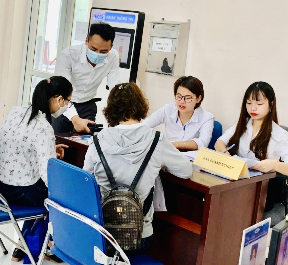 Người lao động đang ứng tuyển phỏng vấn và trao đổi với đại diện DN về vị trí việc làm và tiền lương. Ảnh: Tú Phương