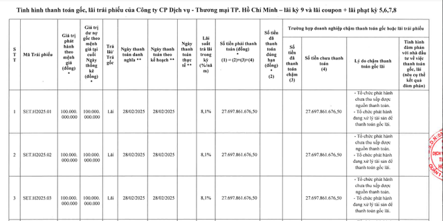 Cụ thể, ngày 28/2/2025 là ngày mà Setra Corp phải thanh toán gần 554 tỷ đồng tiền lãi của tổng cộng 20 lô trái phiếu mã từ SET.H2025.01 đến SET.H2025.20.