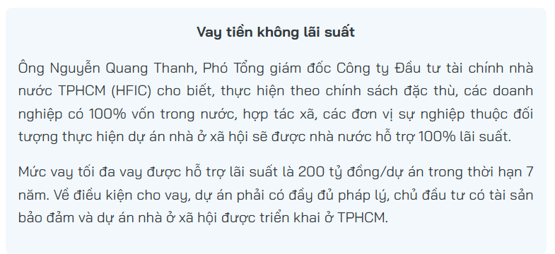 Tiếp đó, TPHCM ban hành trình tự đầu tư xây dựng nhà ở xã hội trên cơ sở cắt giảm tối đa 20% thời gian thực hiện. Kiện toàn Quỹ Phát triển nhà ở TPHCM theo mô hình Quỹ nhà ở quốc gia. Theo đó, quỹ sẽ được TPHCM cấp vốn điều lệ để thực hiện đầu tư xây dựng quỹ nhà ở xã hội cho cán bộ, công chức, viên chức, người lao động thuê để ở, đồng thời kết nối cung cầu tạo ra nguồn tài chính phát triển nhà ở xã hội.