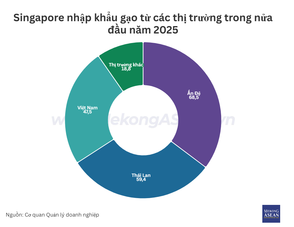 Singapore chi hơn 194 triệu USD nhập khẩu gạo trong nửa đầu 2025. Việt Nam giữ 1/4 thị phần, xếp sau Ấn Độ, Thái Lan nhưng giá trị nhập khẩu lại giảm so với cùng kỳ.