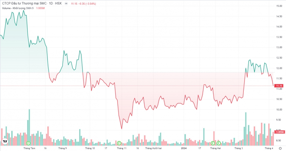 Kết phiên giao dịch 4/4, cổ phiếu SMC đóng cửa ở mức giá 11.150 đồng/cổ phiếu, giảm hơn 3% so với mức giá tham chiếu. Từ đầu năm 2024 đến nay, trong bối cảnh thị trường chứng khoán phục hồi mạnh mẽ với mức tăng hơn 11,6% của chỉ số VN-Index, cổ phiếu SMC ghi nhận mức tăng khá khiêm tốn, chỉ 7,2%.