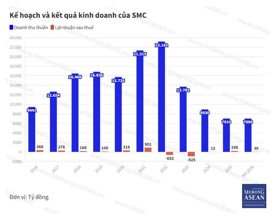 Theo tài liệu họp ĐHĐCĐ thường niên năm 2026 mới công bố, CTCP Đầu tư Thương mại SMC (mã SMC) đặt mục tiêu doanh thu thuần 7.000 tỷ đồng và lợi nhuận sau thuế 30 tỷ đồng. So với năm 2025, chỉ tiêu doanh thu đi ngang còn lợi nhuận sau thuế giảm 85%.