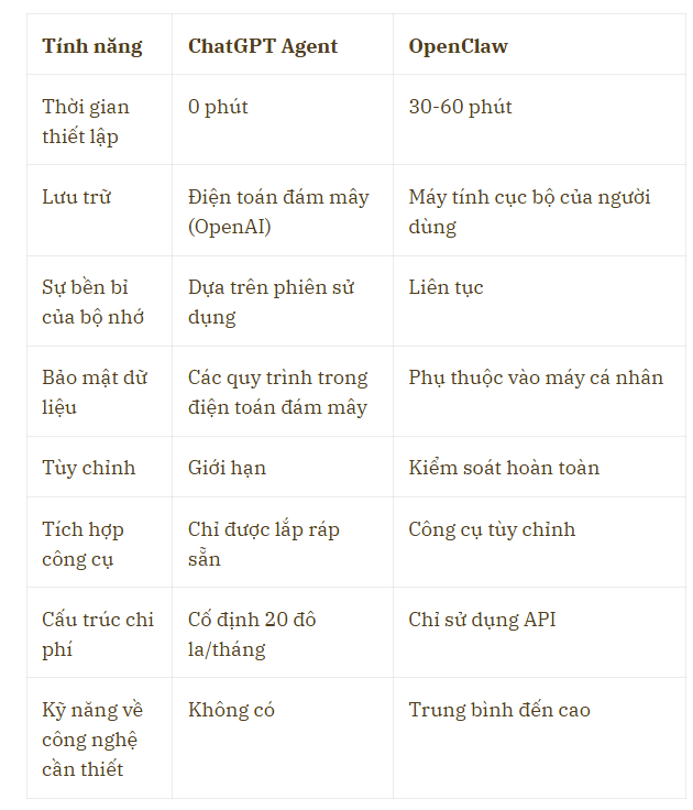 ChatGPT Agent và OpenClaw đại diện cho hai cách tiếp cận khả thi đối với các tác nhân AI vào năm 2026. Một cách tiếp cận ưu tiên tính dễ sử dụng và khả năng truy cập. Cách tiếp cận còn lại ưu tiên tính kiểm soát và khả năng tùy chỉnh.