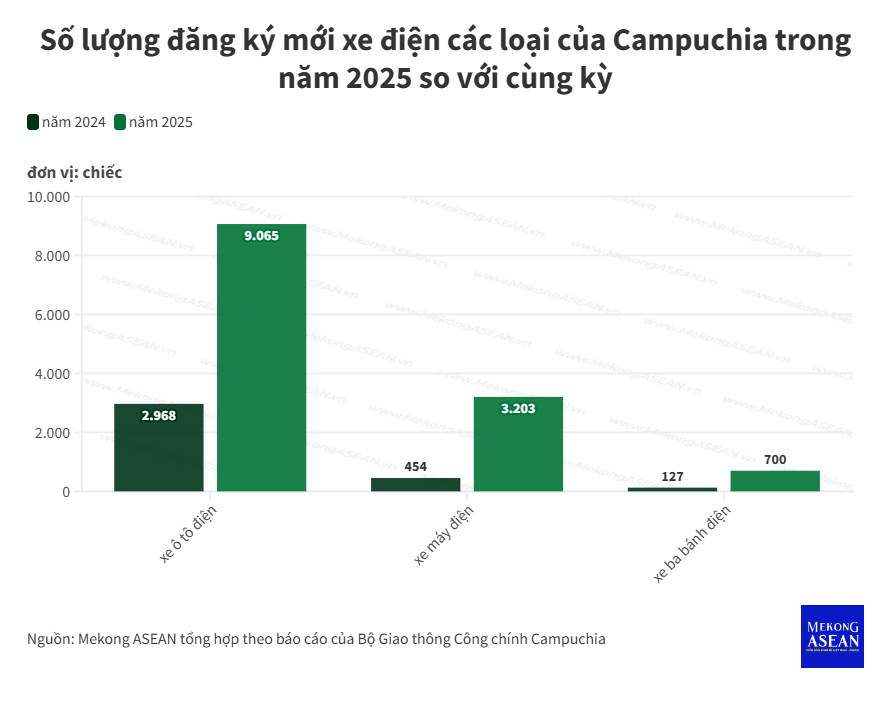 Theo báo cáo của Bộ Giao thông Công chính Campuchia, trong năm 2025, nước này đã đăng ký tổng cộng 9.065 xe ô tô điện, tăng 205% từ mức 2.968 xe đăng ký trong năm 2024.