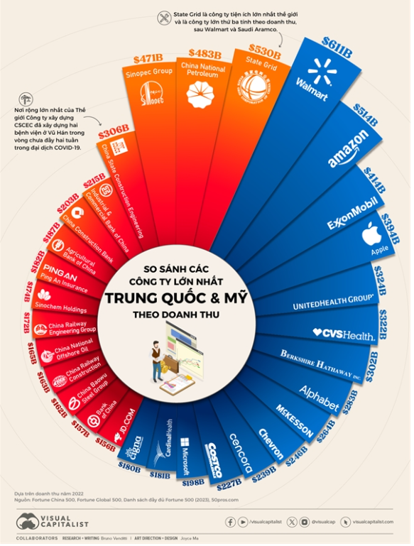 Trong đồ họa dưới đây, đã so sánh 15 công ty lớn nhất của Trung Quốc và Mỹ dựa trên doanh thu năm 2022 của họ, sử dụng dữ liệu từ Fortune China 500 và Fortune Global 500:
