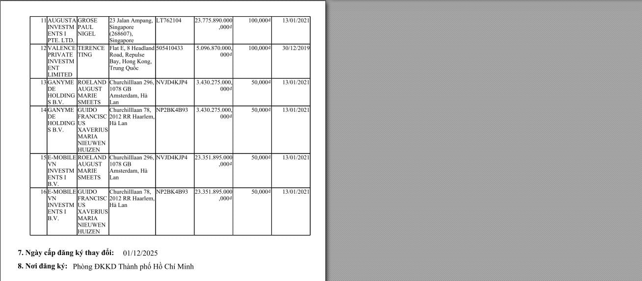 Theo đó, tại đăng ký thông tin doanh nghiệp cấp ngày 1/12/2025 (được đăng tải từ ngày 2/12/2025 đến ngày 1/1/2026), M_Service có biến động nhỏ về vốn điều lệ khi tăng nhẹ từ hơn 179.436.240.000 đồng lên hơn 179.521.430.000 đồng. Trong đó, vốn nước ngoài chiếm 71,259 % tương ứng với giá trị vốn góp ở mức 127.924.550 đồng. Vốn góp tư nhân trong nước của M_Service ở mức 28,741% tương ứng với giá trị vốn góp ở mức 51.596.880.000 đồng.