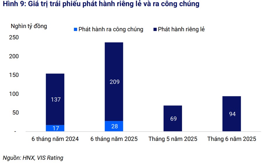 Tháng 6/2025 ghi nhận giá trị phát hành trái phiếu theo tháng cao nhất kể từ năm 2022, đạt 94.000 tỷ đồng, tăng 36% so với tháng trước, trong đó hơn 80% là trái phiếu phát hành riêng lẻ của các ngân hàng.