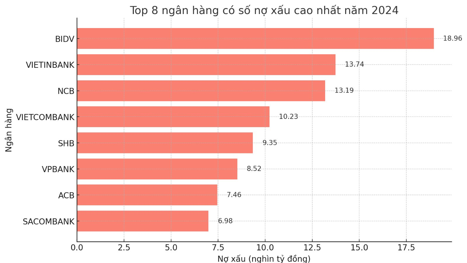 Xét về quy mô, BIDV là ngân hàng dẫn đầu về nợ nhóm 5 trong hệ thống với 18.960 tỷ đồng, tăng 55,26% so với năm 2023. Xếp sau, VietinBank ghi nhận nợ nhóm 5 lần lượt là 13.741. Một ông lớn Big 4 khác là Vietcombank có trên 10.228 tỷ đồng nợ nhóm 5.