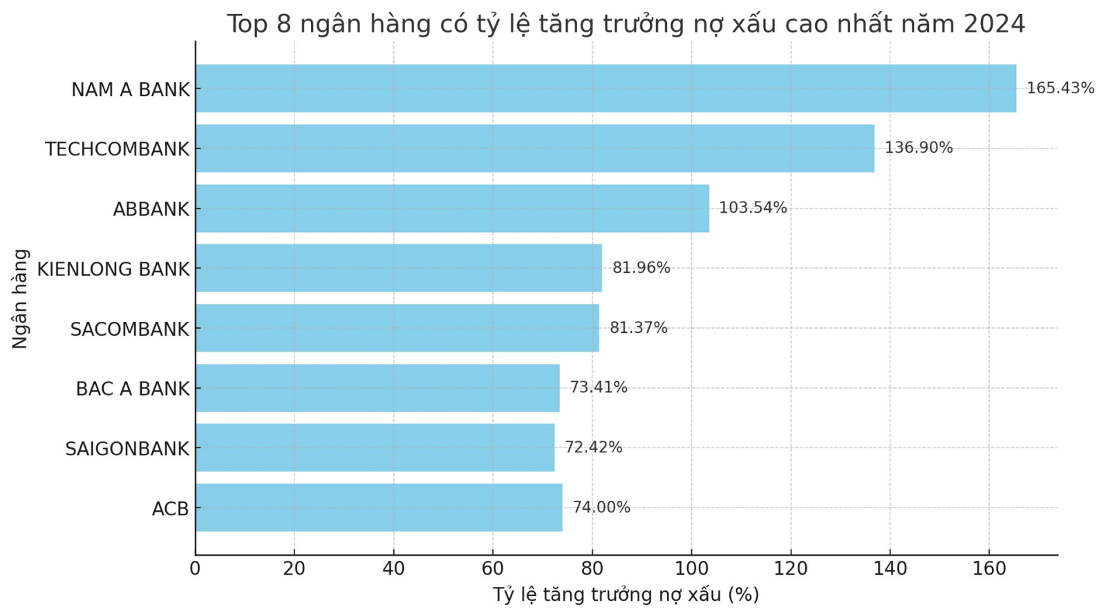 Một số ngân hàng ghi nhận mức tăng nợ nhóm 5 cao hơn cùng kỳ năm 2023. Trong đó, Nam A Bank là nhà băng có tỷ lệ tăng mạnh nhất 165% từ 986 tỷ đồng năm 2023 lên 2.617 tỷ đồng năm 2024. Theo sau, Techcombank tăng 137%, trong khi ABBank tăng hơn 103%. Đây là ba nhà băng ghi nhận nợ nhóm 5 hơn gấp đôi so với cùng kỳ năm 2023.