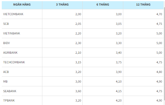 Như vậy, trong nhóm 4 ngân hàng quốc doanh, lãi suất huy động thấp nhất thuộc về Vietcombank với lãi suất tiền gửi kỳ hạn 1-2 tháng là 1,7%/năm, lãi suất tiền gửi kỳ hạn 3-5 tháng là 2%/năm, kỳ hạn 6-9 tháng là 3%/năm và kỳ hạn 12-24 tháng là 4,7%/năm.