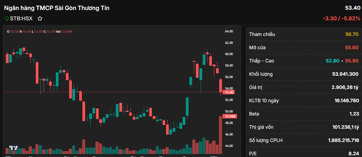 Dù vậy, không phải cổ đông của ngân hàng nào cũng được hưởng niềm vui trong phiên hôm nay. Đáng chú ý, mã STB của Ngân hàng Thương mại Cổ phần Sài Gòn Thương Tín (Sacombank) đối mặt với áp lực bán mạnh xuyên suốt. Có thời điểm cổ phiếu này đã chạm mức giá sàn 52.800 đồng/cp trước khi hồi phục đôi chút.