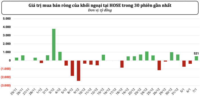 Trên sàn HOSE, khối ngoại mua ròng hơn 521 tỷ đồng, tương ứng khối lượng 33,8 triệu đơn vị.