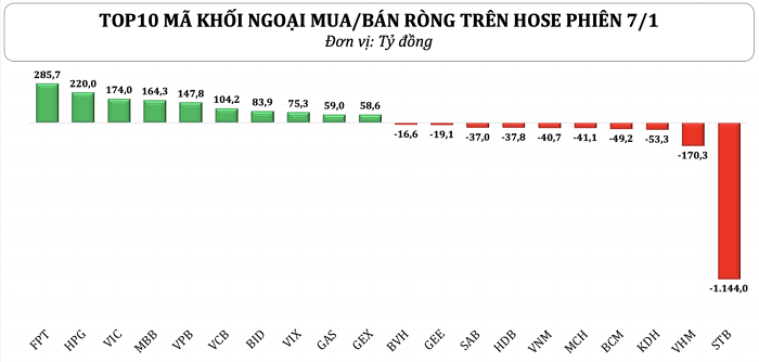 Trong phiên 7/1 nhà đầu tư nước ngoài quay lại mua ròng với tổng giá trị gần 500 tỷ đồng. Dòng tiền tập trung vào các cổ phiếu FPT và HPG, trong khi STB chịu áp lực bán ròng đột biến.