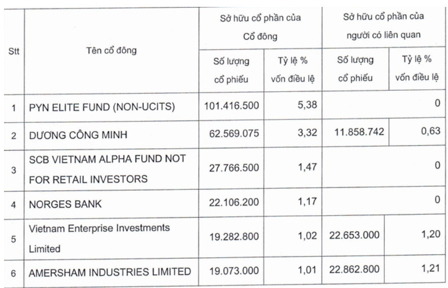 Hai cái tên còn lại bao gồm quỹ ngoại Pyn Elite Fund và chủ tịch HĐQT Dương Công Minh.