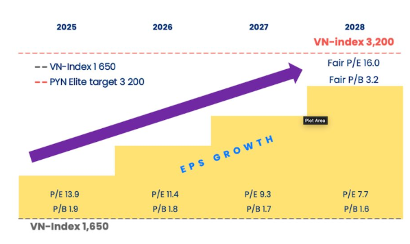 Ông Petri Deryng khẳng định mục tiêu này được xây dựng trên giả định tăng trưởng lợi nhuận doanh nghiệp niêm yết bình quân 18–20%/năm trong các năm tới. Con số này hoàn toàn khả thi trong vòng 3 năm tới dựa trên mức tăng trưởng lợi nhuận doanh nghiệp trung bình từ 18-20% mỗi năm. Với đà tăng trưởng này, định giá P/E của thị trường vào năm 2028 sẽ đạt mức hợp lý là 16,0 (so với mức định giá rẻ hiện tại).