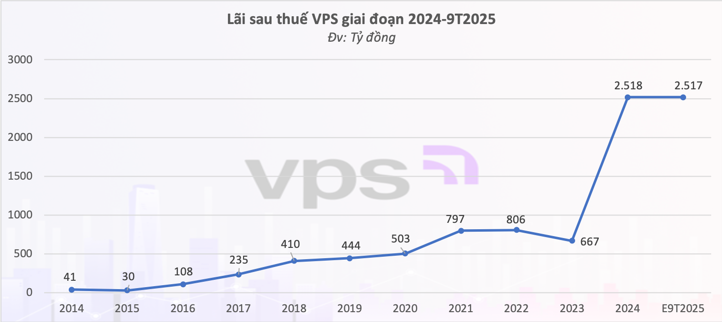 Nhìn lại chặng đường 10 năm từ lúc thay đổi cơ cấu cổ đông và ban lãnh đạo (năm 2015) đến nay, chỉ trừ năm 2023 suy giảm do thị trường giảm mạnh, lợi nhuận sau thuế của VPS liên tục tăng trưởng. Năm 2024 chỉ tiêu này đạt 2.518 tỷ đồng, gấp 80 lần năm 2015. 9 tháng đầu năm 2025, doanh nghiệp này ước lãi sau thuế 2.517 tỷ đồng, bằng cả năm ngoái và hoàn thành 90% kế hoạch năm.