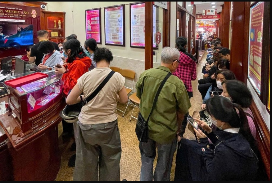 Người dân xếp hàng mua vàng tại Công ty TNHH Bảo Tín Minh Châu (Hà Nội), tháng 4-2025. Ảnh: NGUYỄN HUYỀN