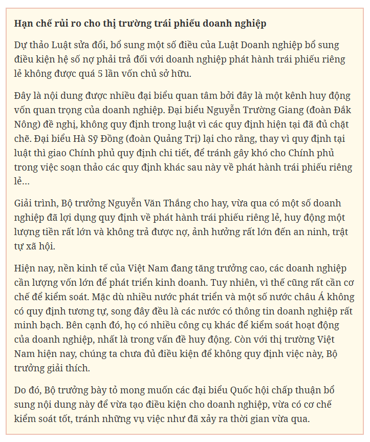 Tuy nhiên, cần phân định rõ nghĩa vụ của doanh nghiệp có vốn đầu tư lớn và doanh nghiệp nhỏ để tránh tạo thêm nghĩa vụ cho doanh nghiệp nhỏ và vừa. Bởi, theo đại biểu, các doanh nghiệp nhỏ phần lớn do gia đình và người thân điều hành, ít bị chi phối bởi chủ sở hữu hưởng lợi doanh nghiệp.