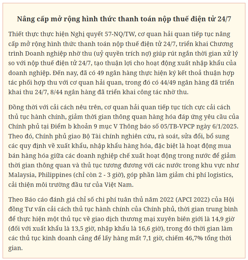 Thực hiện Nghị quyết 57-NQ/TW, Nghị quyết số 192/2025/QH15 và Nghị quyết 190/2025/QH15 của Quốc hội, Nghị quyết số 03/NQ-CP của Chính phủ, Bộ Tài chính (Cục Hải quan) đã tổ chức rà soát các văn bản quy phạm pháp luật hiện hành trong lĩnh vực hải quan để đề xuất những chính sách đột phá, tháo gỡ kịp thời điểm nghẽn về pháp luật, tạo thuận lợi cho doanh nghiệp hoạt động trong lĩnh vực phát triển khoa học, công nghệ, đổi mới sáng tạo, chuyển đổi số góp phần thúc đẩy tăng trưởng kinh tế đạt mục tiêu 8% trở lên.