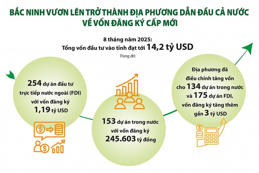 Số liệu từ Sở Tài chính Bắc Ninh cho thấy, 8 tháng năm 2025, Bắc Ninh tiếp tục chứng tỏ sức hút mạnh mẽ với dòng vốn đầu tư trong nước và quốc tế. Tổng vốn đầu tư vào tỉnh đạt tới 14,2 tỷ USD sau 8 tháng. Trong đó, có 153 dự án trong nước với vốn đăng ký 245.603 tỷ đồng; 254 dự án đầu tư trực tiếp nước ngoài (FDI) với vốn đăng ký 1,19 tỷ USD. Đồng thời, địa phương đã điều chỉnh tăng vốn cho 134 dự án trong nước và 175 dự án FDI, vốn đăng ký tăng thêm gần 3 tỷ USD. Như vậy, sau khi sáp nhập với Bắc Giang, Bắc Ninh đã vươn lên trở thành địa phương dẫn đầu cả nước về vốn đăng ký cấp mới.