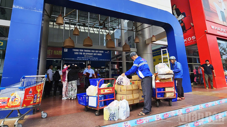 Theo ghi nhận của phóng viên, lượng khách đến các siêu thị trong khu vực như Co.opmart và Go! Quy Nhơn cũng tăng mạnh. Bình quân mỗi ngày, siêu thị Co.opmart Quy Nhơn đón khoảng 6.500 lượt khách, gấp 3-4 lần so với ngày thường. Các quầy hàng thiết yếu luôn trong tình trạng “cháy hàng” cục bộ vào cuối giờ chiều.