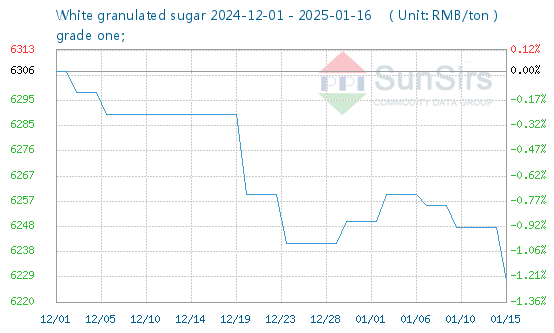 Theo giám sát của hệ thống phân tích thị trường hàng hóa SunSirs, giá trung bình đường trắng loại một tại Trung Quốc là 6.260 RMB/tấn vào đầu tuần và 6.248 RMB/tấn vào cuối tuần, với mức giảm giá là 0,19%.