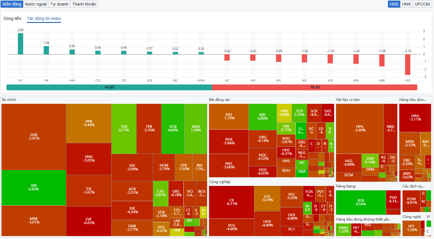 Trong gần một giờ giao dịch, VN-Index từ chỗ tăng hơn 11 điểm, quay đầu giảm gần 40 điểm so với tham chiếu về 1.614,6 điểm lúc 10h55. Chỉ số phục hồi nhẹ sau đó, tính đến 11h10, VN-Index giảm 27,3 điểm về còn 1.626,8 điểm, tương ứng mức giảm 1,65%. Toàn sàn HOSE chỉ có 52 mã tăng, so với 292 mã giảm điểm điểm, với thanh khoản toàn sàn đạt 40.187 tỷ đồng khớp lệnh.