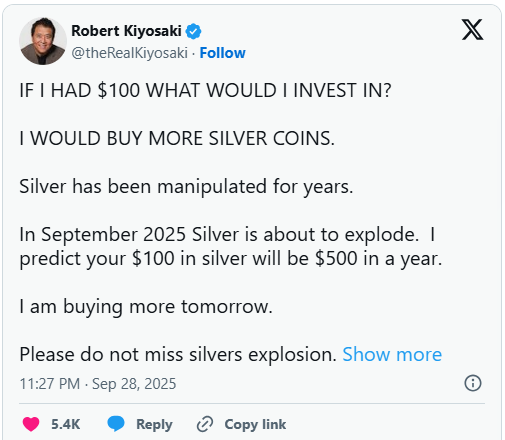 Cụ thể, trong bài đăng trên mạng xã hội X ngày 28/9, Robert Kiyosaki cho biết: “Nếu chỉ có 100 USD, tôi sẽ mua bạc. Thị trường bạc sắp bùng nổ. Tôi dự đoán với 100 USD hôm nay có thể trở thành 500 USD trong vòng một năm.” Bài đăng nhanh chóng nhận được sự chú ý của đông đảo người theo dõi.