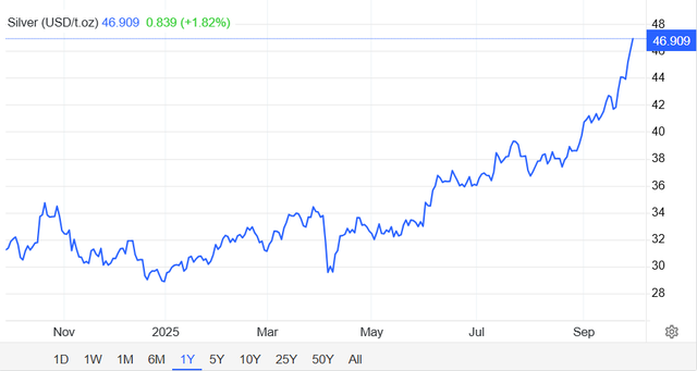 Theo số liệu thị trường, bạc khởi đầu năm 2025 ở mức khoảng 28,92 USD/ounce. Đến cuối tháng 9, giá đã leo lên gần 47 USD/ounce, tương ứng mức tăng hơn 55% từ đầu năm đến nay. Đây là một trong những mức tăng mạnh nhất của bạc trong hơn một thập kỷ.
