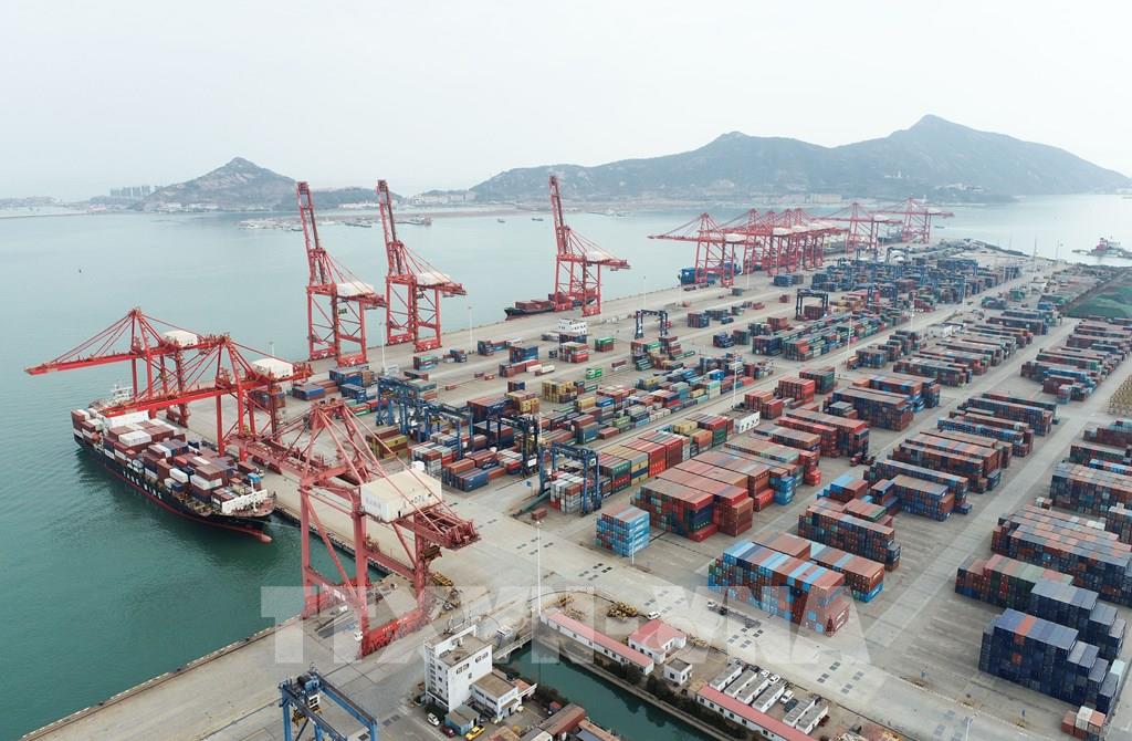 Trong ảnh: Hoạt động bốc xếp hàng hóa tại cảng ở tỉnh Sơn Đông, Trung Quốc. Ảnh: THX/TTXVN