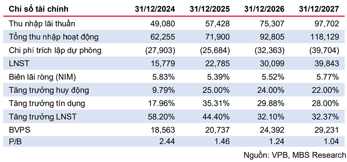 Với kỳ vọng các công ty con sẽ đóng góp đáng kể hơn vào kết quả kinh doanh của VPBank, MBS đã điều chỉnh dự phóng lợi nhuận sau thuế 2025 và 2026 của ngân hàng lên lần lượt 22.785 tỷ đồng và 30.099 tỷ đồng, tăng 44,4% và 32,1% so với cùng kỳ. Đồng thời, nâng giá trị sổ sách trên mỗi cổ phiếu lên 24.392 đồng/cp vào cuối năm 2026, tương ứng P/B ở mức 1,24 lần sau thương vụ IPO VPBankS.