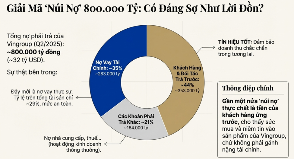 Con số tổng nợ phải trả gần 800.000 tỷ đồng (khoảng 31 tỷ USD) của Vingroup có thể gây lo ngại cho nhiều nhà đầu tư mới. Việc bóc tách cấu trúc nợ sẽ cho thấy một bức tranh hoàn toàn khác. Bóc tách cấu trúc nợ:
