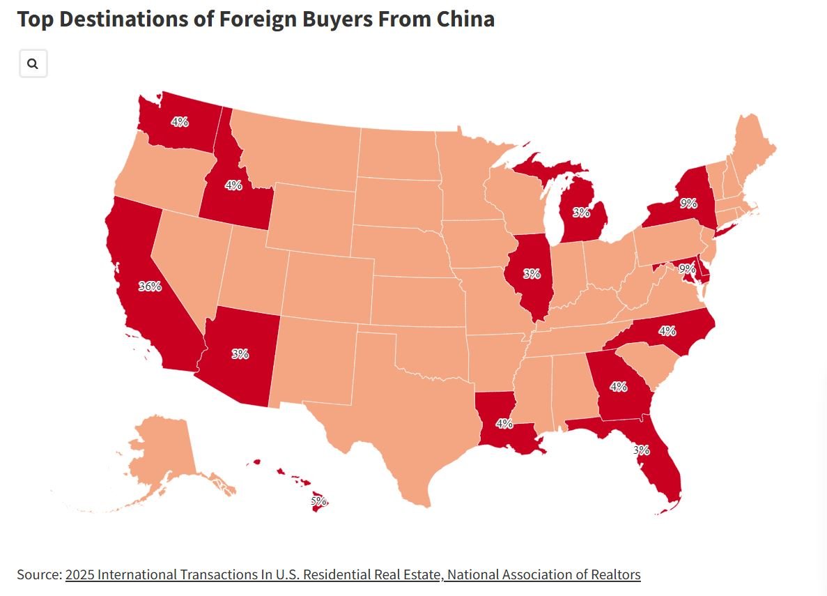 Theo báo cáo mới nhất của Hiệp hội Môi giới Bất động sản Quốc gia Mỹ (NAR) về các giao dịch quốc tế trong lĩnh vực bất động sản nhà ở, người mua Trung Quốc đã chi 13,7 tỷ USD trong tổng số 56 tỷ USD mà người nước ngoài bỏ ra để mua nhà tại Mỹ, trong giai đoạn từ tháng 4/2024 đến tháng 3/2025.