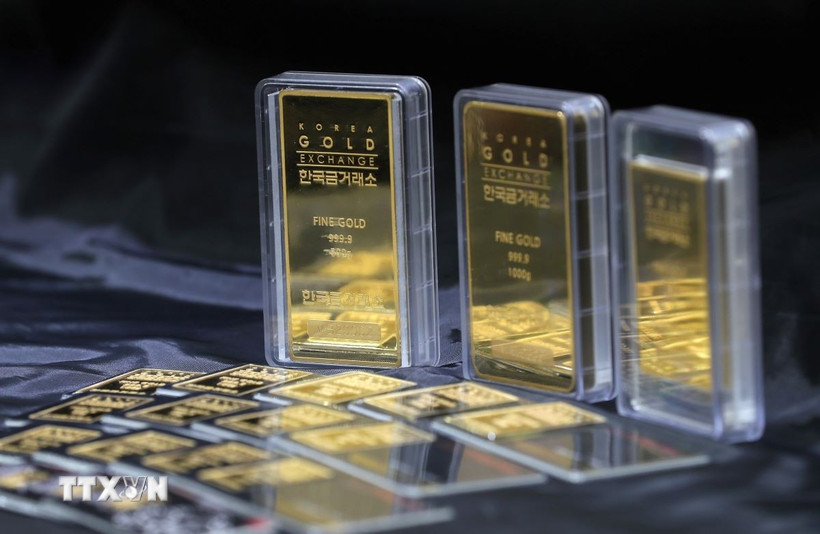Vàng miếng được bày bán tại sàn giao dịch ở Seoul, Hàn Quốc. (Ảnh: Yonhap/TTXVN)