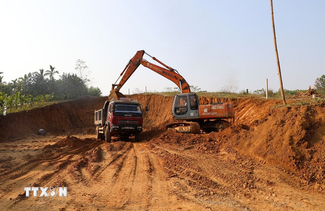 Đất san lấp cũng là mặt hàng khan hiếm và tăng giá trong thời điểm hiện tại, khiến nhiều công trình trọng điểm gặp khó. (Ảnh: Việt Hoàng/TTXVN)