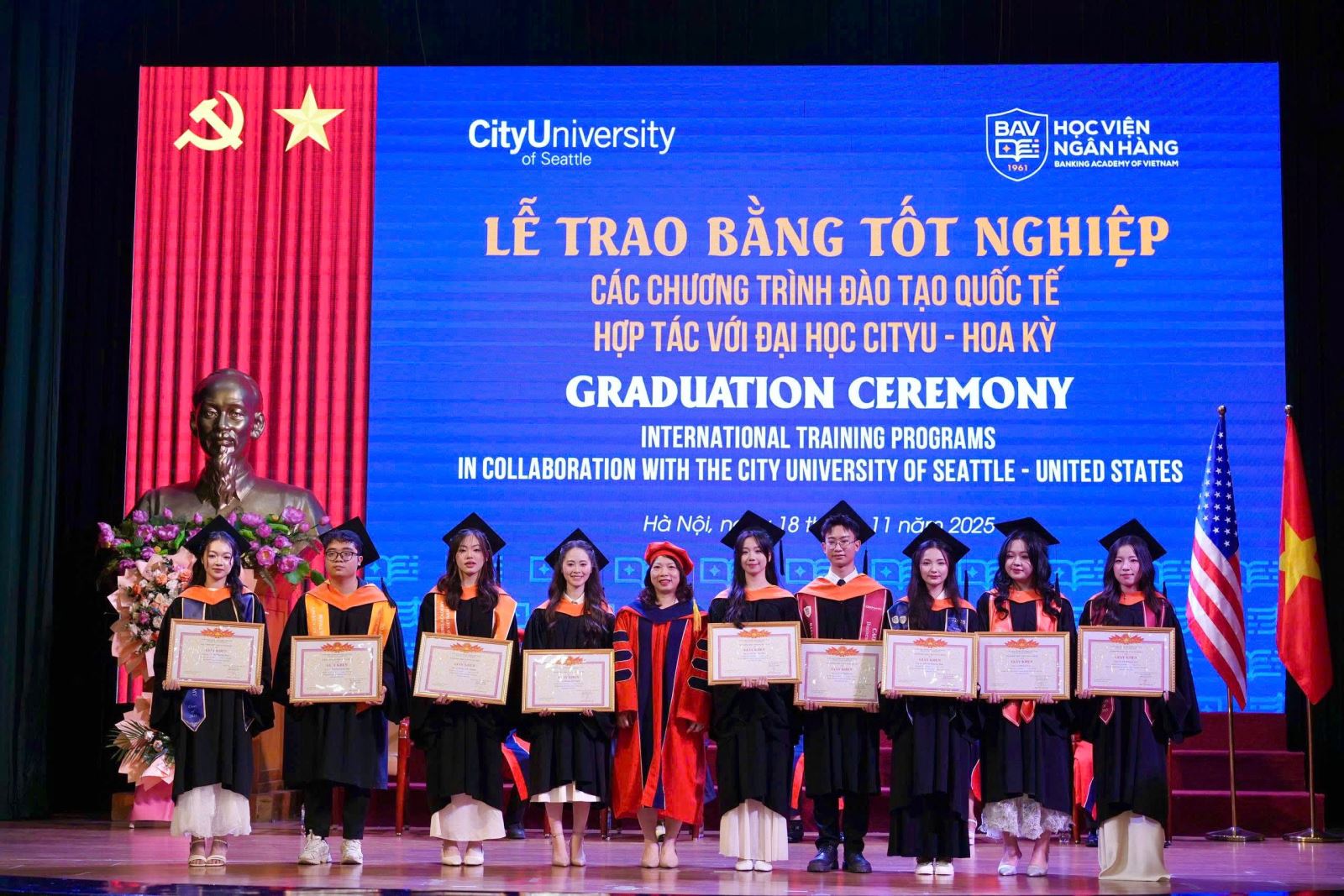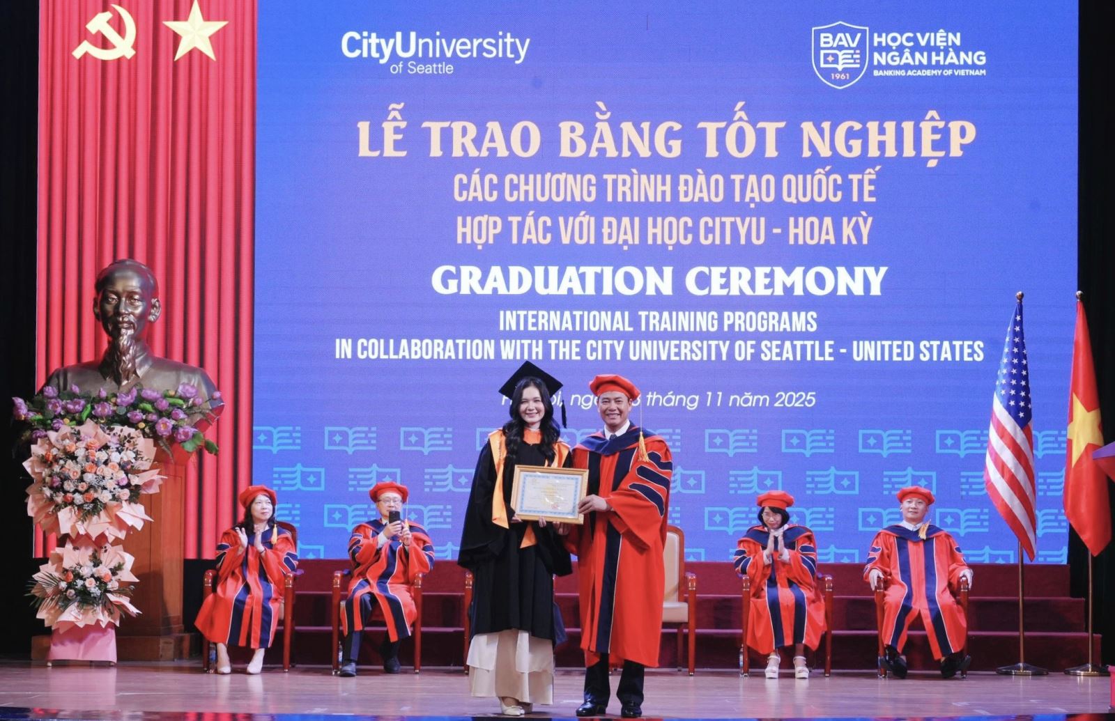 Ngày 18/11/2025, tại Hội trường lớn D1, Học viện Ngân hàng (BAV) tổ chức Lễ trao bằng tốt nghiệp Chương trình Cử nhân Quản trị kinh doanh liên kết với City University of Seattle, Hoa Kỳ (CityU) khóa 10 và chương trình Thạc sĩ Quản trị kinh doanh chuyên sâu Fintech (MBA Fintech) khóa 1. Sự kiện không chỉ đánh dấu cột mốc quan trọng trong hành trình hợp tác ổn định và phát triển giữa hai đơn vị suốt 15 năm qua, mà còn là kết quả ghi nhận bước tiến trong quan hệ hợp tác quốc tế giữa hai cơ sở giáo dục uy tín.