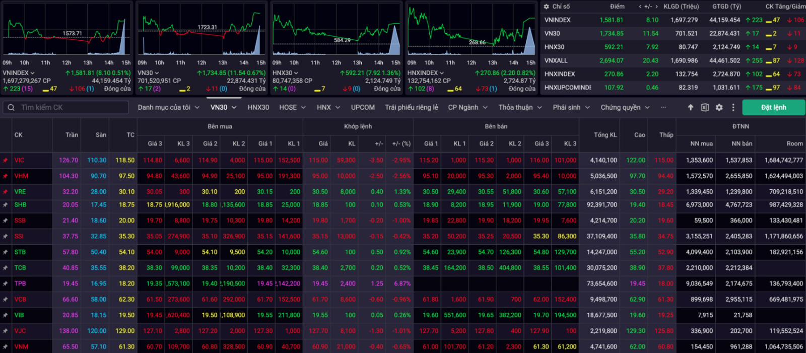 Thị trường chứng khoán tiếp tục duy trì sắc xanh trong phiên giao dịch ngày 7/8 với đà tăng lan tỏa rộng khắp và thanh khoản ở mức cao. Chỉ số VN-Index kết phiên tại 1.581 điểm, tăng hơn 8 điểm so với tham chiếu. Chỉ số VN30 ghi nhận diễn biến tích cực hơn khi vượt mốc 1.730 điểm, đóng cửa tại 1.734 điểm, tương ứng mức tăng hơn 11 điểm.