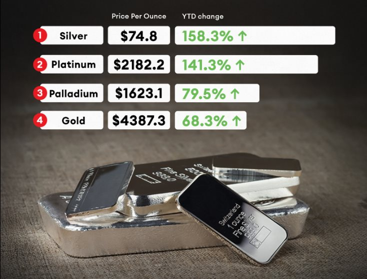 Biến động giá các kim loại quý trong năm 2025 so với thời điểm đầu năm. Ảnh: Forbes Middle East Einglish