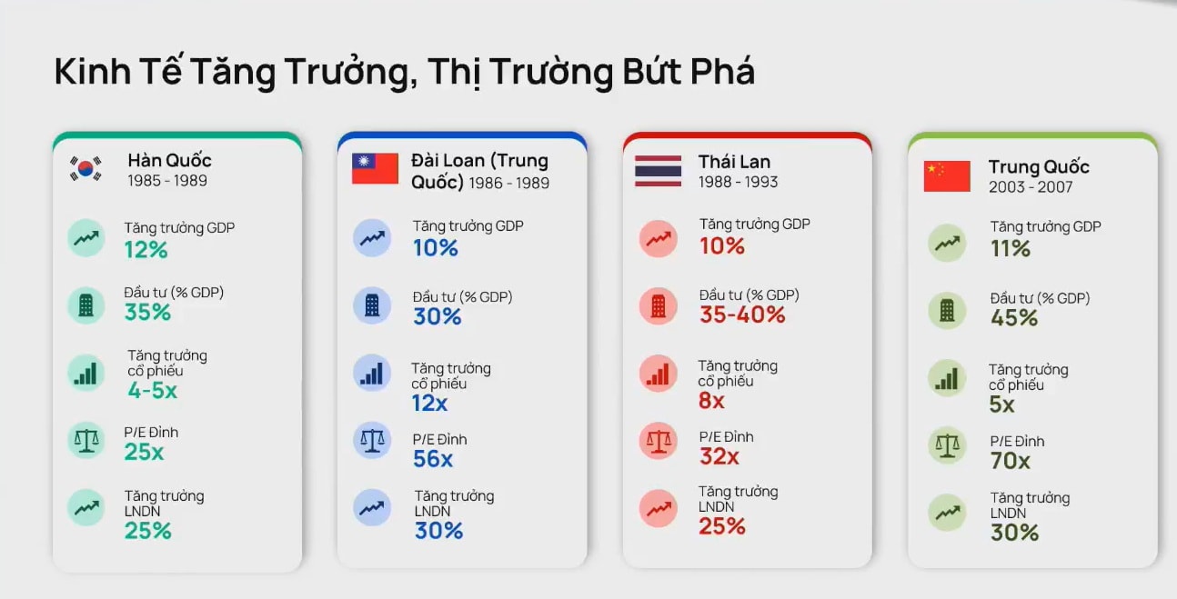 Không dừng lại ở đó, khi kinh tế tăng trưởng mạnh, lợi nhuận doanh nghiệp thường tăng bình quân 25–30% mỗi năm. Trong môi trường như vậy, định giá thị trường sẽ được đẩy lên rất cao.